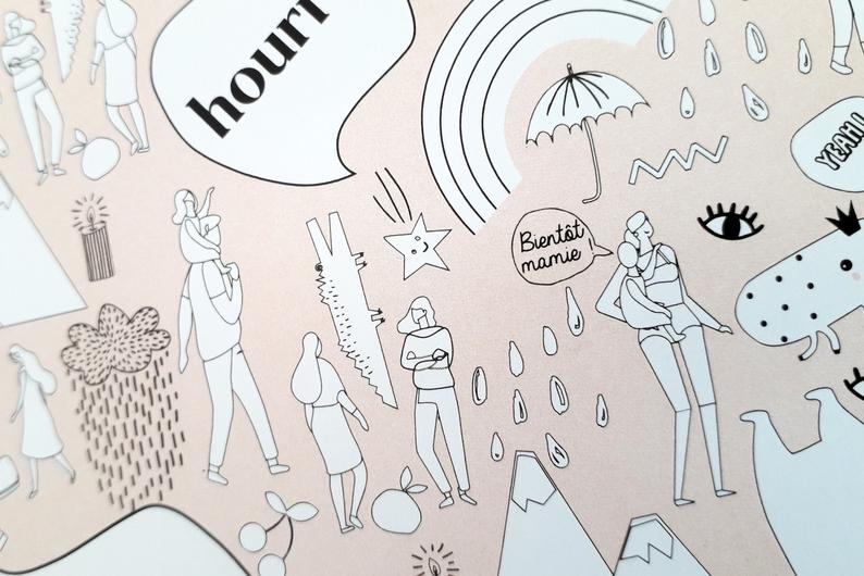 Carte qui se déplie en poster sur lequel tu dois trouver un personnage et son message dans une bulle. Même principe que Où est Charlie, pour ceux qui connaissent :) Originalité garantie.