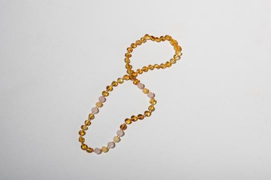Collier en ambre miel poli, quartz rose et ambre citron enfant OU adulte.