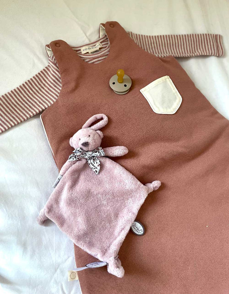 Noann l'ours en peluche est un petit doudou avec boucle pour attacher à la tétine.