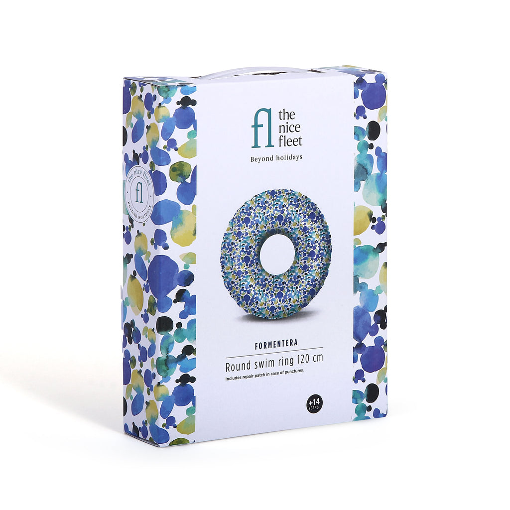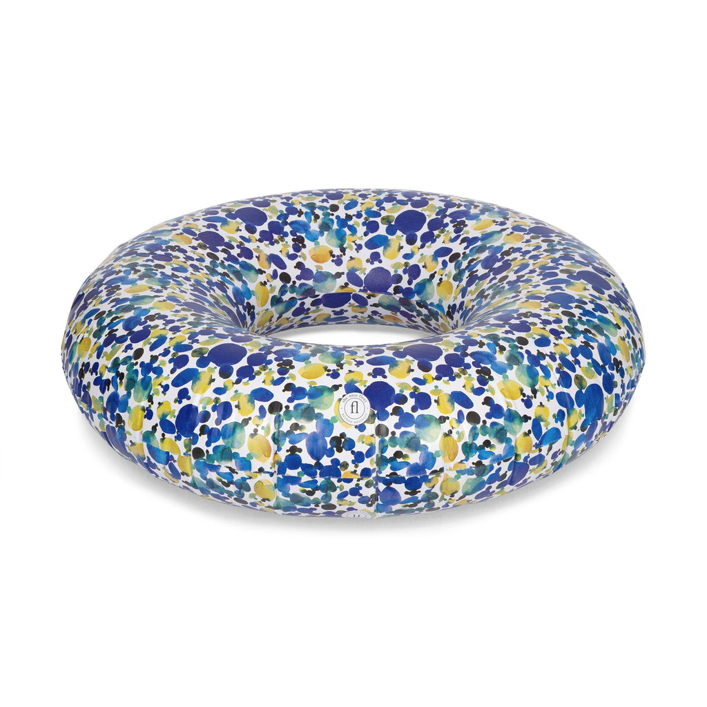 Grande bouée ronde gonflable de 1,2 m de diamètre, aux motifs tachetés bleus, jaune, verts, ... aux couleurs de l'eau au large de Formentera.