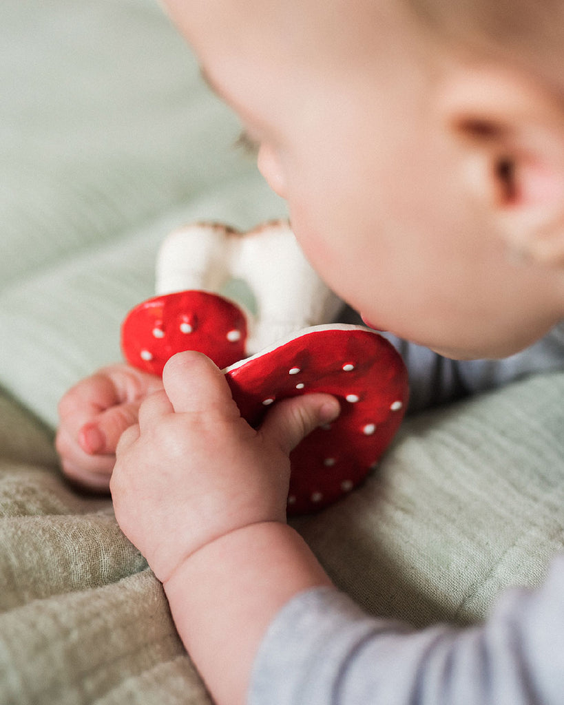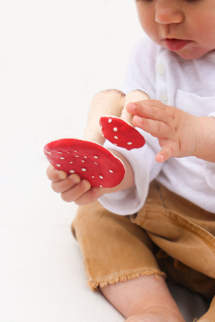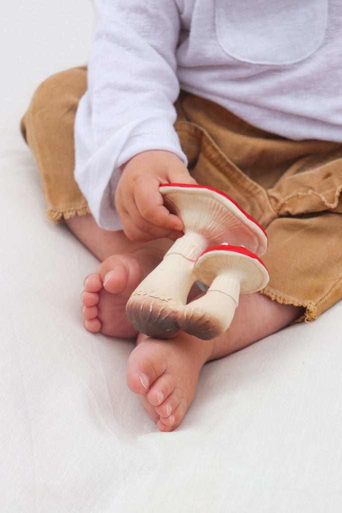 Découvrez Spot le Champignon! Ce jeu de dentition en forme de champignon stimulera les sens de bébé tout en apaisant ses petites gencives.