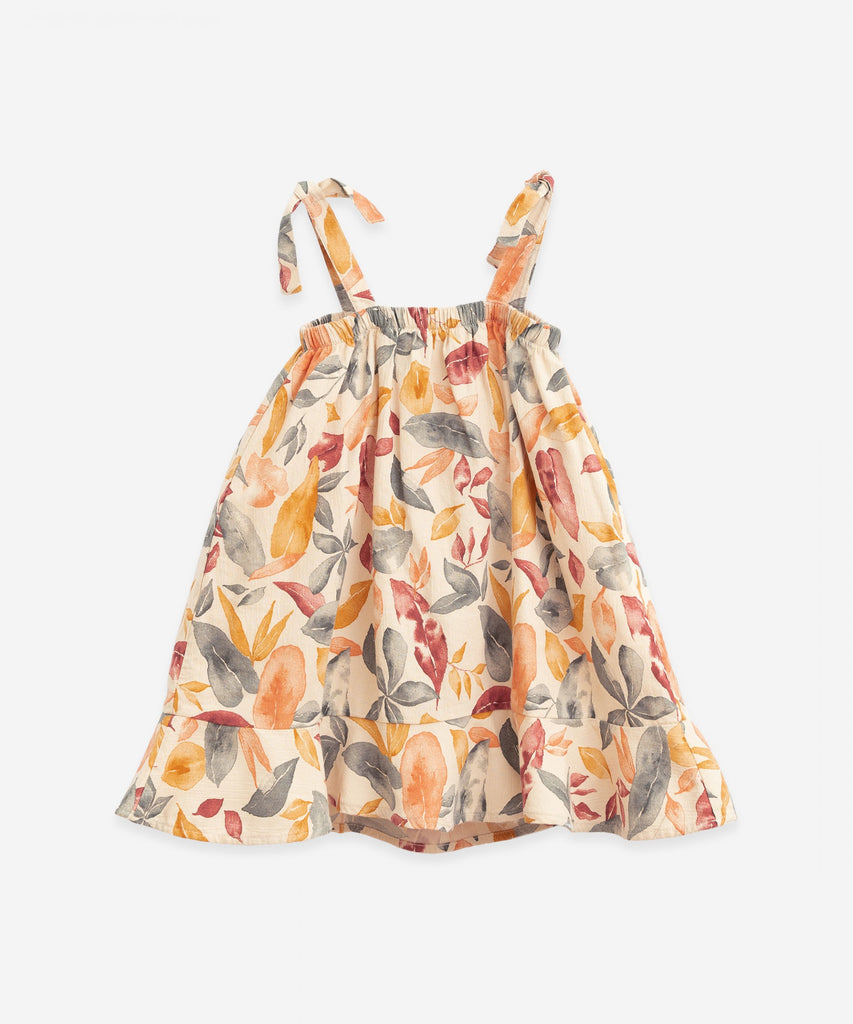 Robe en coton tissé avec feuilles dans les tons bruns, beiges & orangés, imaginée et produite avec amour au Portugal.