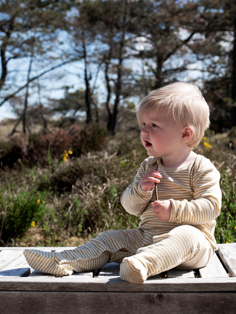 Rayures mélangées douces en côtes 100% coton biologique couleur avoine et blanc cassé.